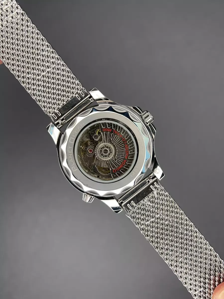 ساعت Omega Seamaster Diver 007 Edition با طراحی خاص و قاب استیل ضدزنگ، یکی از مدلهای برجسته برند اُمگا است. این ساعت دارای صفحه نقرهای و بیضی با دستهای مشکی و نشانگرهایی برای وضوح بیشتر است. قاب با رنگ آبی و بند حصیری استیل، به آن ظاهری مدرن و لوکس بخشیده است. این ساعت بهویژه برای علاقهمندان به سینما و طرفداران جیمز باند، به دلیل طراحی خاص و الهامگرفته از شخصیت جیمز باند مناسب است. این مدل از ویژگیهای فنی بالا برخوردار است و برای استفاده در استایلهای اسپرت لوکس و کژوال مناسب است.