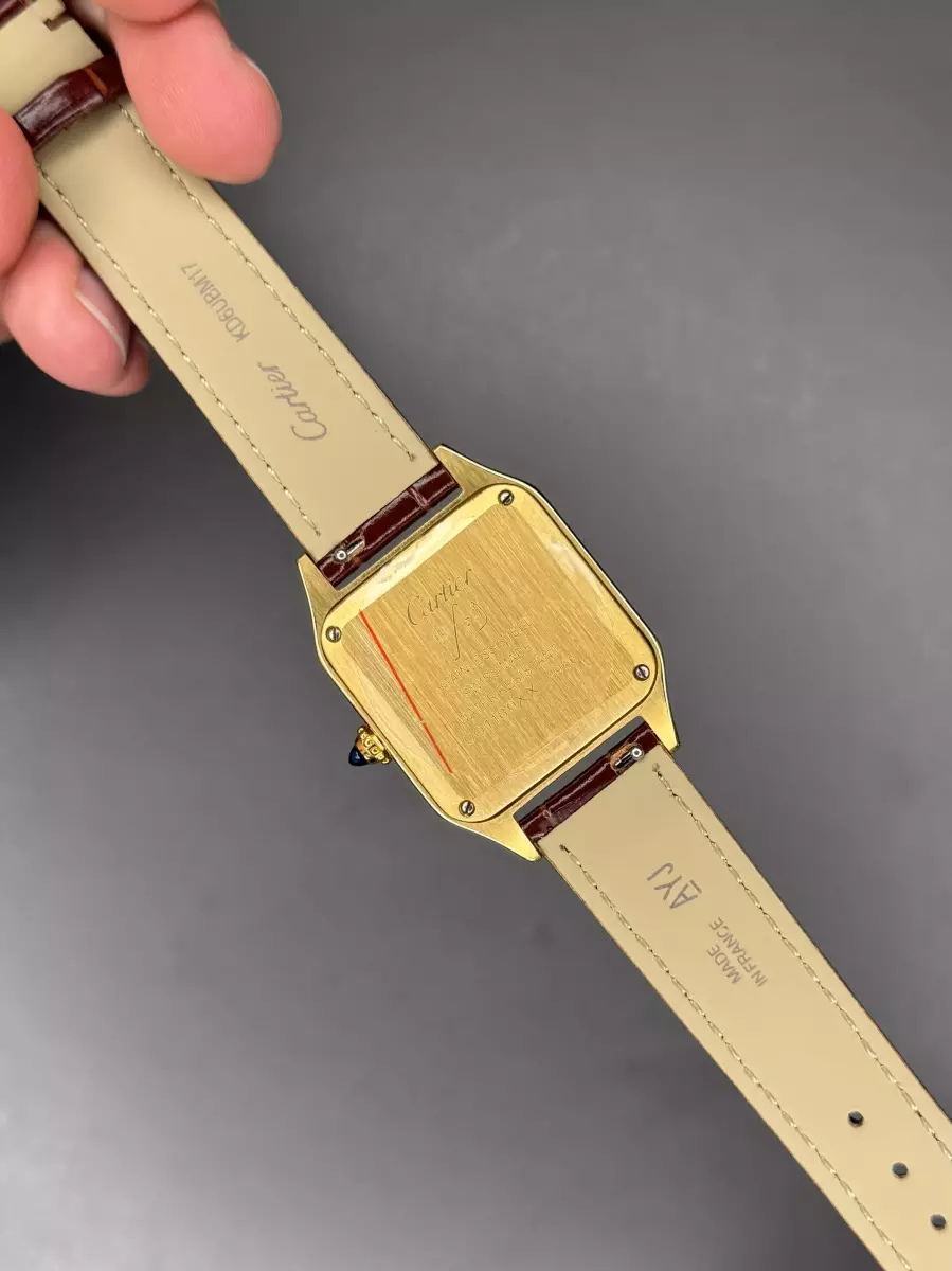 - ساعت مچی کارتیه دومونت بند چرمی قهوه ای قاب طلایی Cartier